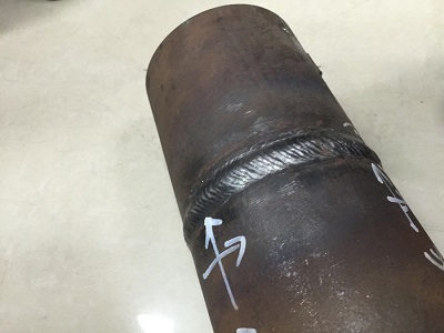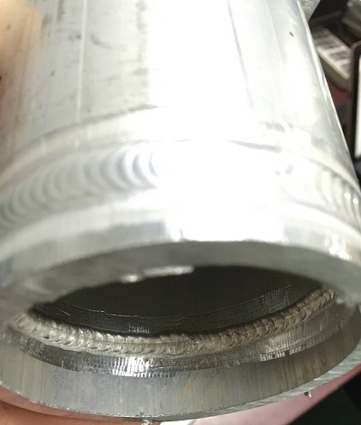 第二模塊鋁合金構建中鋁管的焊接難點主要在于背部融透(如圖6)和內在質量的保證。背部融透主要是考驗選手對熔池的理解,在組對焊縫0間隙的情況下,如何能夠識別熔池溫度是否達到,送遞焊絲時間的選擇,這些都至關重要,而且在焊接過程中,由于鋁合金的導熱系數(shù)大,焊接過程中隨著溫度的上升,焊接速度也會越來越快,如果手法跟不上,只是依靠小電流慢速焊,這樣就會在某一點(比如引弧處)不停的加熱,局部時間加熱久了焊縫內部會很容易出現(xiàn)過熱裂紋,焊縫表面發(fā)白無光澤,所以鋁合金焊接一般要求大電流快速焊接,也是為了在引弧初期就能夠快速打開鋁合金表面的Al2O3薄膜。該薄膜熔點高達2050℃,極大地超出了鋁的熔點(660℃),由于這層薄膜的保護,所以鋁不易產(chǎn)生腐蝕,但在焊接時,Al2O3會阻礙熔池金屬良好結合,容易形成夾渣氣孔等缺陷,可以說是焊接的障礙,所以在鋁合金焊接中要想達到探傷一級確實很難。一般要先進行酸堿水清洗或機械清理等前期處理。還要保證干燥不潮濕的情況下焊接才能夠保證質量,當然對于選手的焊接操作技能也是首選。這次參賽的65名選手中,該項射線探傷滿分40分的情況下只有一人滿分,30分以上的有7人,內在質量不得分的占多數(shù)。這與鋁合金焊接普及面較窄也有關系。隨著這項賽事的不斷進展。我想在不久將來大家一定會攻克難關,充分掌握好這門技術。