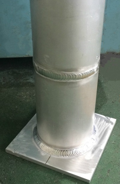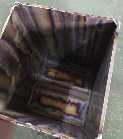 對于第三模塊中不銹鋼結構件的焊接,個人觀點是其焊接難點要更甚于鋁合金的焊接。眾所周知不銹鋼在高溫狀態(tài)下非常容易氧化,而且變形量也較大。這次的不銹鋼結構件組對完畢后,所有焊縫根據(jù)要求都不允許留間隙、開坡口焊接,并在背部充氣的情況下實現(xiàn)單面焊雙面成型(如圖7),它的焊接難點之一首先是為防止變形,如何選擇好組對之后的焊接順序,其次是焊接過程中如何能夠保證一次焊接背部成型和表面焊縫成型不氧化,乍聽起來好像這兩點有些矛盾,首先要想保證在不留間隙的情況向背面焊透,就要使熔池的溫度充分達到,而熔池溫度一旦過高焊縫表面就很容易氧化發(fā)黑,本屆比賽各路選手也是各顯其能,對于氬弧焊噴嘴的使用從6號嘴到10號甚至更大都有使用。其實從理論上來講,要想使氬弧焊接不銹鋼表面成型好,顏色好,主要就是氣體的保護效果,如果比賽允許使用氬氣保護拖罩進行三重保護,即熱影響區(qū)也保護起來,那么焊縫達到銀白色的金屬光澤也是有可能的,但這次只允許兩重保護(即內充氣和氬弧槍本身氣體),那么對于焊縫的正表面只能采取大口徑噴嘴進行,才能擴大保護范圍,如果條件允許,也可以采用噴嘴內裝有濾網(wǎng)的大口徑噴嘴進行焊接,這樣的氣體保護會更均勻。但前提是采用大噴嘴口徑的焊槍對焊接過程中選手對熔池觀察的視線會有所影響,也要逐漸適應。這次大賽對于大噴嘴的使用只有少數(shù)單位想到了這一點。隨著本次大賽的結束,我想以后對于不銹鋼焊接的氧化問題,會有更多的單位熟悉、掌握,甚至想出更好的辦法來解決不銹鋼焊接氧化的問題。